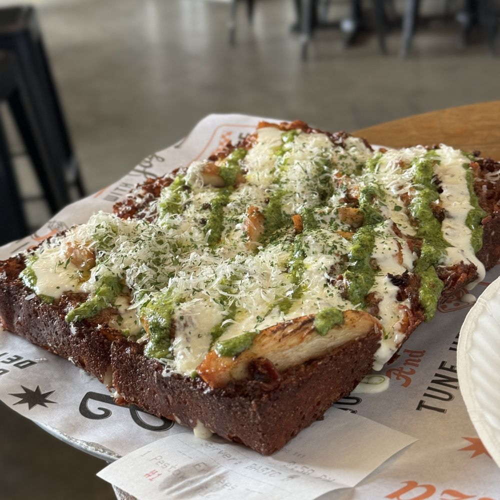 Layonna's vegan chicken, vegan bacon, mozzarella & brick cheese, topped with pesto and ranch * Contain nutsVegan chicken made from soy protein, natural flavors and spices. (GF)